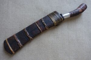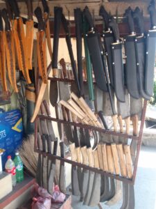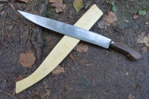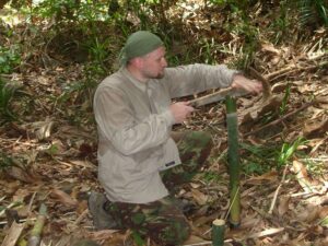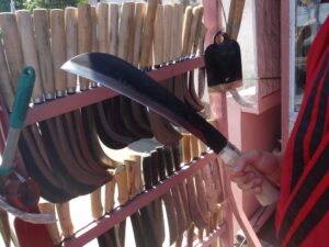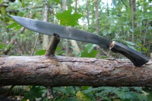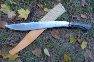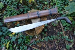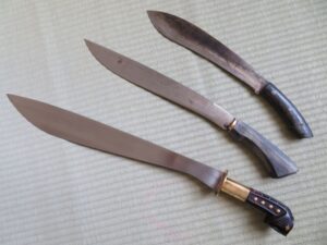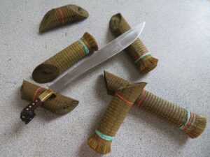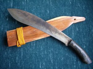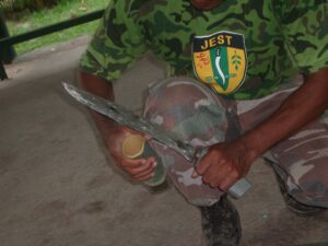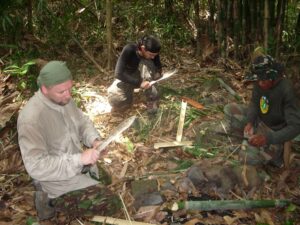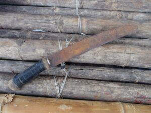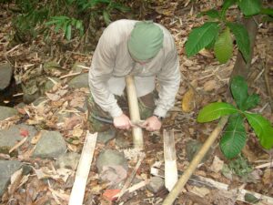 Měli jsme možnost naučit se a vyzkoušet si nejen bezpečné ovládání tohoto nástroje, ale také i jeho universální používání. Pracovali jsme hlavně s živým i starým bambusem. Odsekávali jsme, páčili, řezali, vydlabávali, atp. Vyzkoušeli jsme si například vyrobit z bambusu hrníček, lžíci i vidličku. Dále nám bylo předvedeno jakým způsobem si vytvořit improvizovaný bambusový „hrnec“ na uvaření rýže či masa.