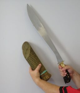 S modelem Filipino Memorial Bolo jsem se zaměřil prioritně na sečné i bodné techniky. Ostrost a houževnatost čepele jsem vyzkoušel na několika smotaných namočených trávových rohoží tatami omote. U této jedno ruční zbraně se jako naprosto funkční ukázaly techniky diagonálních seků a přímé body. Velmi se osvědčil i tvar rukojeti, který doslova zabraňuje vypadnutí zbraně z ruky. Určitě nadchne většinu praktikantů filipínských bojových umění.